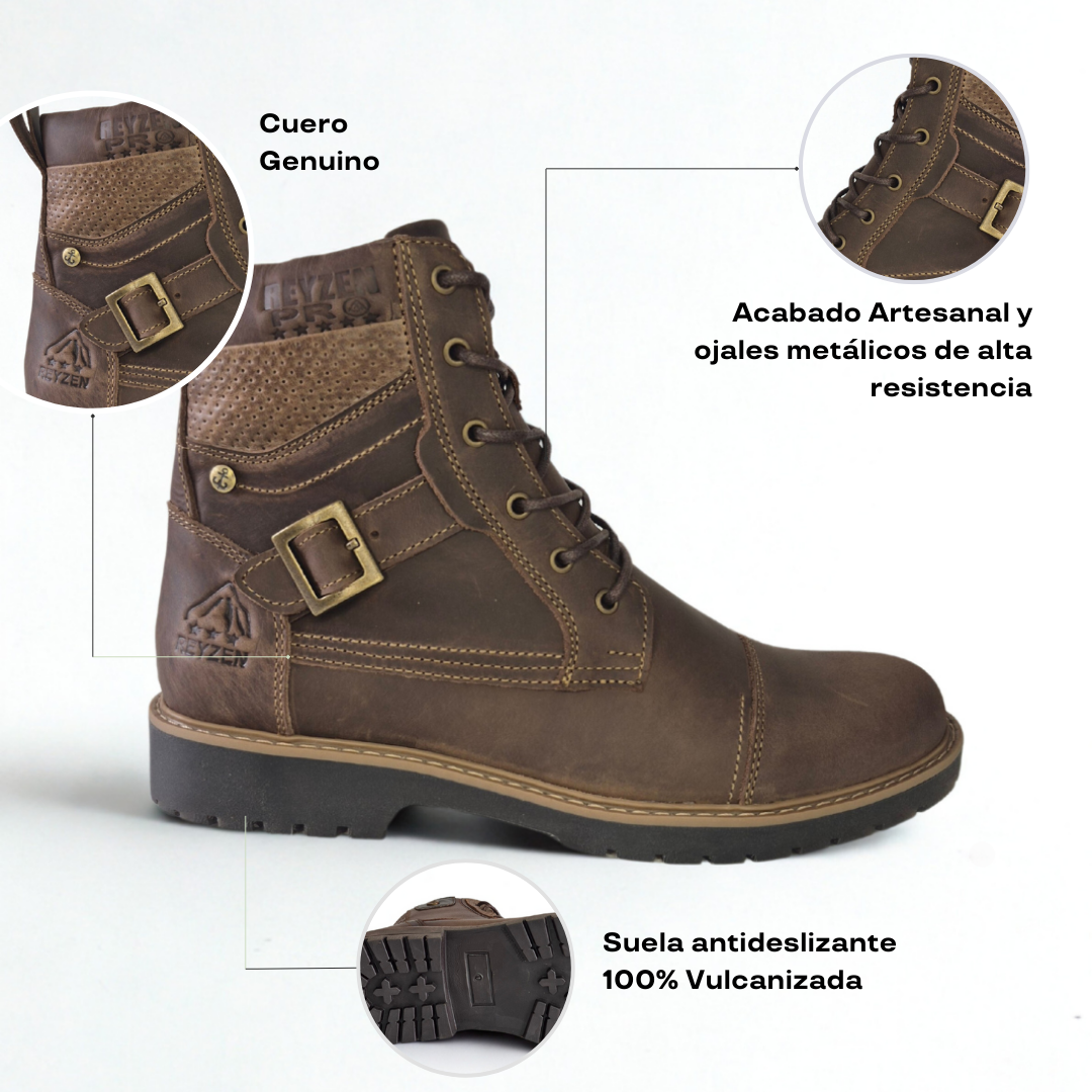 Las Botas Modelo Tristan de Reyzen ofrecen una combinación única de estilo y comodidad. Elaboradas en cuero natural, estas botas destacan por su cordonera con herrajes metálicos y cordones encerados que aportan un toque de distinción.
